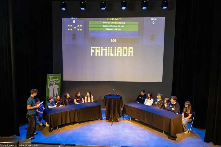 W hali widowiskowej przy Przedszkolu „Słoneczne” w Wasilkowie zrobiło się tego dnia głośno od śmiechu, emocji i szybkich odpowiedzi. Wasilkowska Familiada Międzyszkolna, przygotowana przez Młodzieżową Radę Gminy Wasilków, zamieniła szkolną rywalizację w widowisko, w którym liczyły się i wiedza, i zgranie. Pytania potrafiły zaskoczyć – obok pocztu królów Polski pojawiły się lokalne symbole Wasilkowa oraz najpopularniejsze gry komputerowe. Na trybunach siedzieli nie tylko kibice z poszczególnych szkół, ale też samorządowcy i seniorzy, więc ten finał miał wyraźnie międzypokoleniowy charakter.