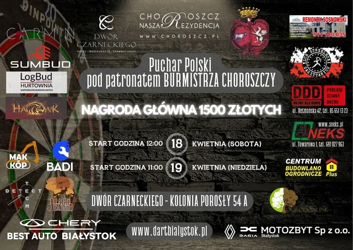 W Kolonii Porosły tarcze staną w równym szeregu, a weekend 18–19 kwietnia wypełni sport o zaskakująco twardych nerwach. Do Dworu Czarneckiego przyjadą zawodnicy z całej Polski, by powalczyć w II edycji Pucharu Polski Steel Darta. Wydarzenie odbywa się pod honorowym patronatem burmistrza Choroszczy i ma szansę znów mocno wybrzmieć poza granicami gminy. Tu nie chodzi o przypadek – o wyniku decydują precyzja, spokój i ręka, która nie drży w decydującym momencie.