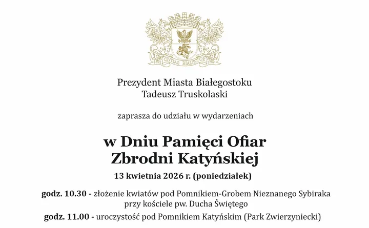 W Białymstoku główne miejskie obchody odbędą się przy Pomniku Mordu Katyńskiego w Parku Konstytucji 3 Maja. To tam o godz. 11.00 miasto odda hołd 86. rocznicy zbrodni katyńskiej i ofiarom Kozielska, Ostaszkowa oraz Starobielska, a także więźniom Kijowa i Mińska zamordowanym przez NKWD w 1940 r. Prezydent Białegostoku Tadeusz Truskolaski zaprasza mieszkańców na te uroczystości, które mają przypomnieć, że za wielką historią stoją konkretni ludzie i konkretne nazwiska.