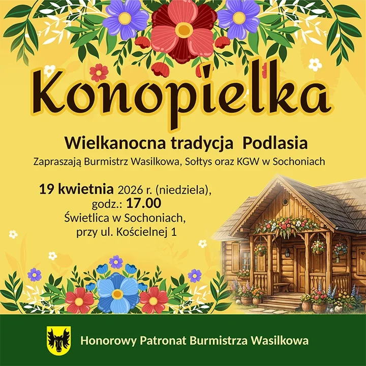 Konopielka – Wielkanocna tradycja Podlasia odbędzie się 19 kwietnia 2026 roku, w niedzielę, o godz. 17.00 w świetlicy w Sochoniach przy ul. Kościelnej 1. W zaproszeniu podpisanym przez burmistrza Wasilkowa, sołtysa i Koło Gospodyń Wiejskich w Sochoniach znalazły się trzy stałe punkty programu: inscenizacja wielkanocnego zwyczaju, przyśpiewki z zespołem oraz poczęstunek.